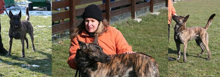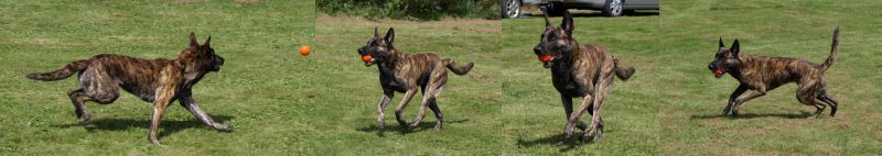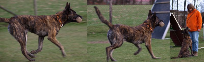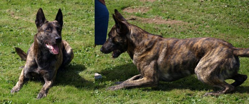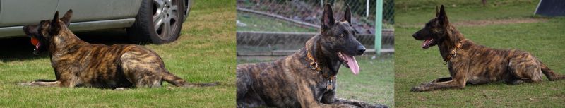 Er ist ein sehr kompakter muskoköser satter Rüde, mit einer schönen Fellzeichnung und kontrastreicher Stromung. Die Stromung setzt sich auch im Gesicht durch.