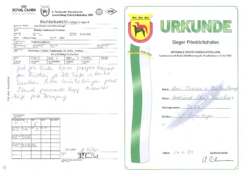Die 3. Ausstellung war in Friedrichshafen. Da war ich mit Ares Picasso alleine. Ohne die Geschwister von Ihm. Leider gibt es da keine Bilder, aber das Ausstellungsergebnis.