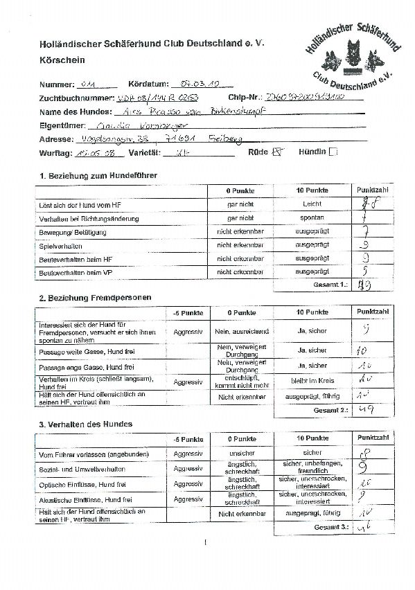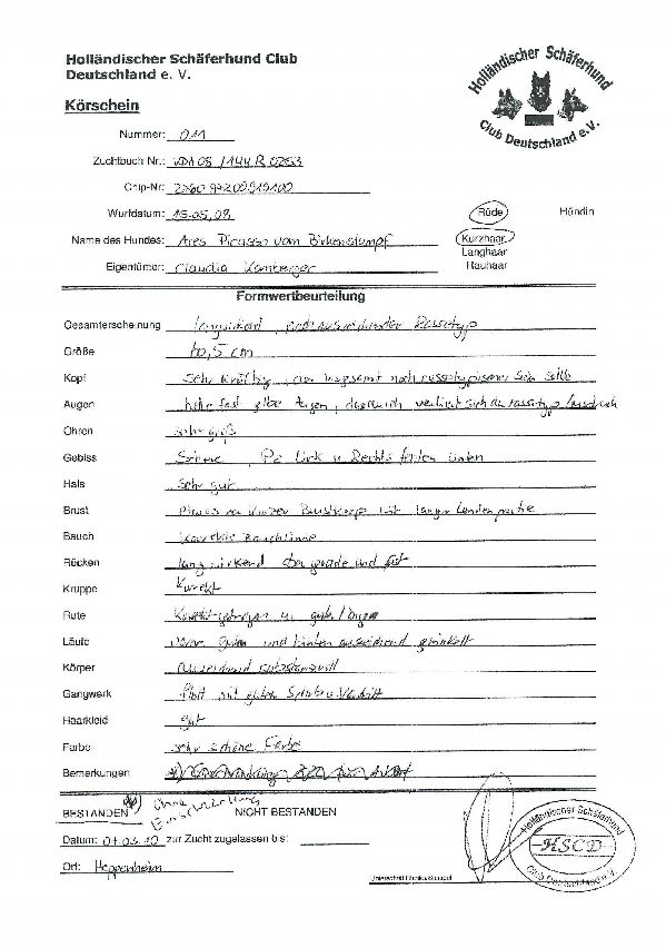 Am 07.03.2010 war es dann endlich soweit. Er bekam eine Zuchtzulassung und zwar UNEINGESCHRÄNKT beim HSCD. Ares und ich haben uns ganz "dolle" gefreut. Erst stand da nämlich "eingeschrenkt". Nachdem der Richter meinen Ares jedoch bei der Wesensüberprüfung gesehen hat, meinte er "der muss in die Zucht". Somit hat er ihm eine "uneingeschränkte Zuchtzulassung" bescheinigt.