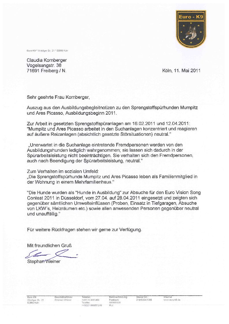 Die Absuche wurde vor dem "Euro Vision Song Contes" durchgeführt. Hier das Schreiben von Euro - K9